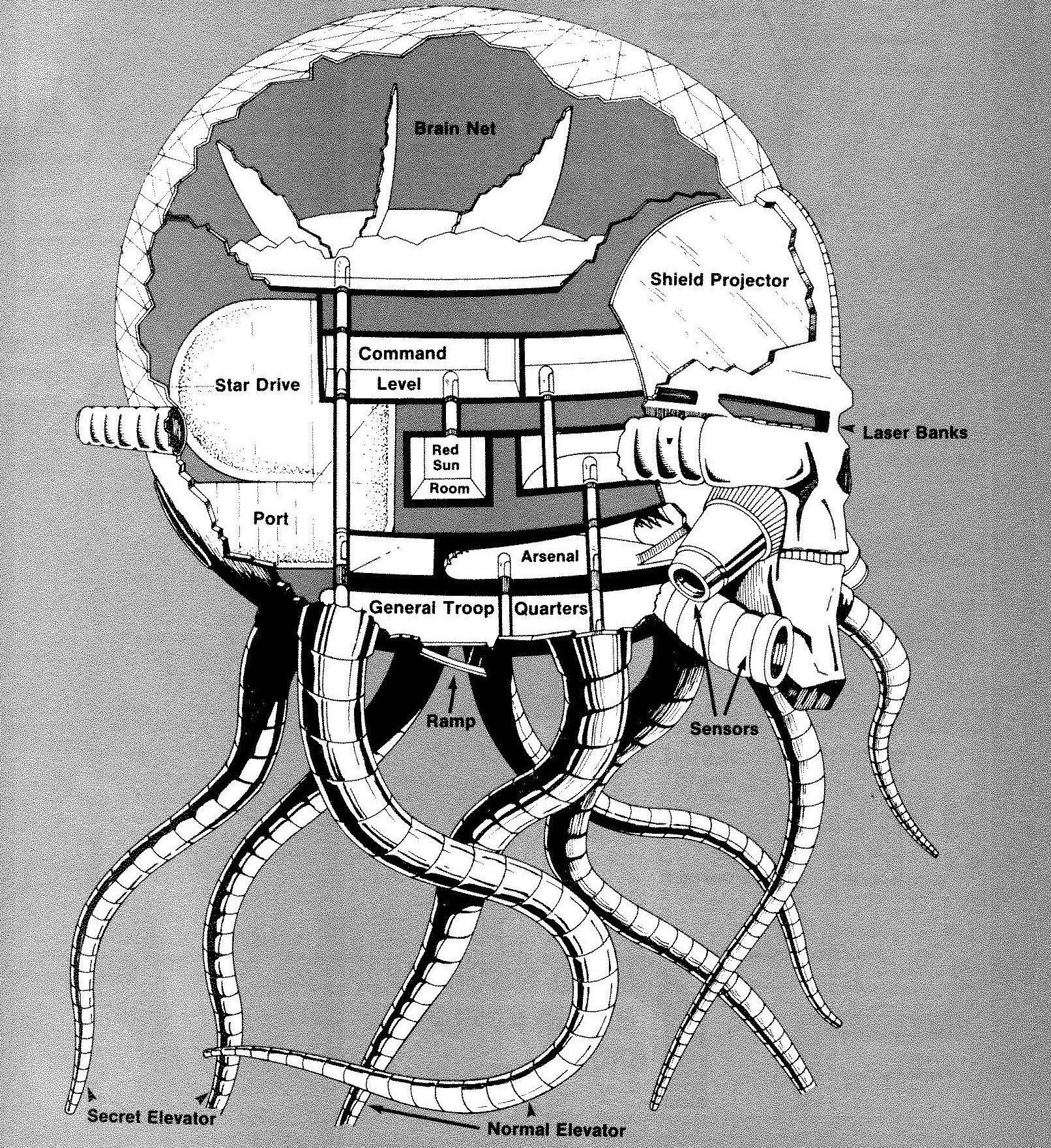 His ship was shaped like his upgraded head and has massive tentacles which protruded from below.