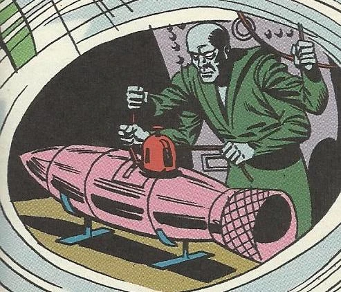In the parallel-universe of Earth-One, Brainiac is in his interstellar saucer. He is under attack from an unknown assailant. It is Grax. After a short battle he defeats Brainiac, but instead of destroying him, Grax jeers at Braniniac because he only has a twelfth order brain and that he has a twentieth order brain. He then tells Brainiac that he is tired of Superman’s interference[3] and only wants Brainiac’s Force-Shield. Since his quarrel is not with Brainiac, he renders him unconscious and heads out to defeat Superman. Sometime later, Grax arrives at earth. He drops a container of bombs towards earth as a way to distract Superman. As Superman retrieves the falling container, he struck by an object, that affixes a bomb to Superman’s waist. It’s a K-Meson bomb. The nuclei of atoms is designed to explode with such force as to destroy a planet. It’s wired to explode if tampered with or go off in 24 hrs. Grax then surrounds the entire earth with the stolen Force-Shield. Grax then leaves earth, only telling Superman that there is only one thing on earth that can disarm the bomb. After consulting with the world’s leading scientists, all seems lost until Brainiac contacts Superman telling him there is a way to escape the Force-Shield. Brainiac tells him to get a huge magnet and draw Grax’s ship to the Force-Shield. Grax then tells Superman how to disarm the bomb. Realizing that once its disarmed he won’t have enough to fly away, he boards Grax’s ship and generates a Force-Shield around it. Superman and Brainiac part ways saying that they are even. Surprisingly, Grax was able to use a device to turn himself into an immaterial phantom. Although he survived, the blast hurled him far into space. And for now… he drifts.[4]
