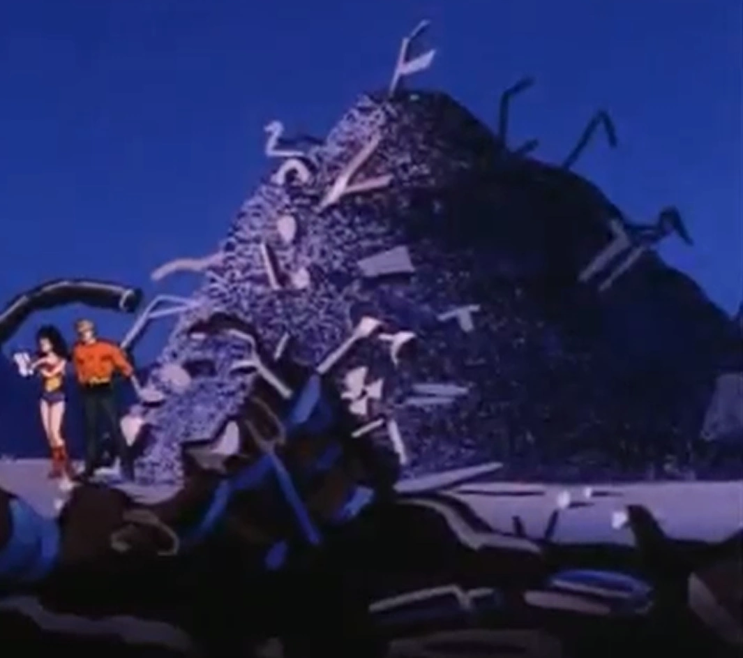 Wonder Woman and Aquaman standing next to a large pile of junk.[1]