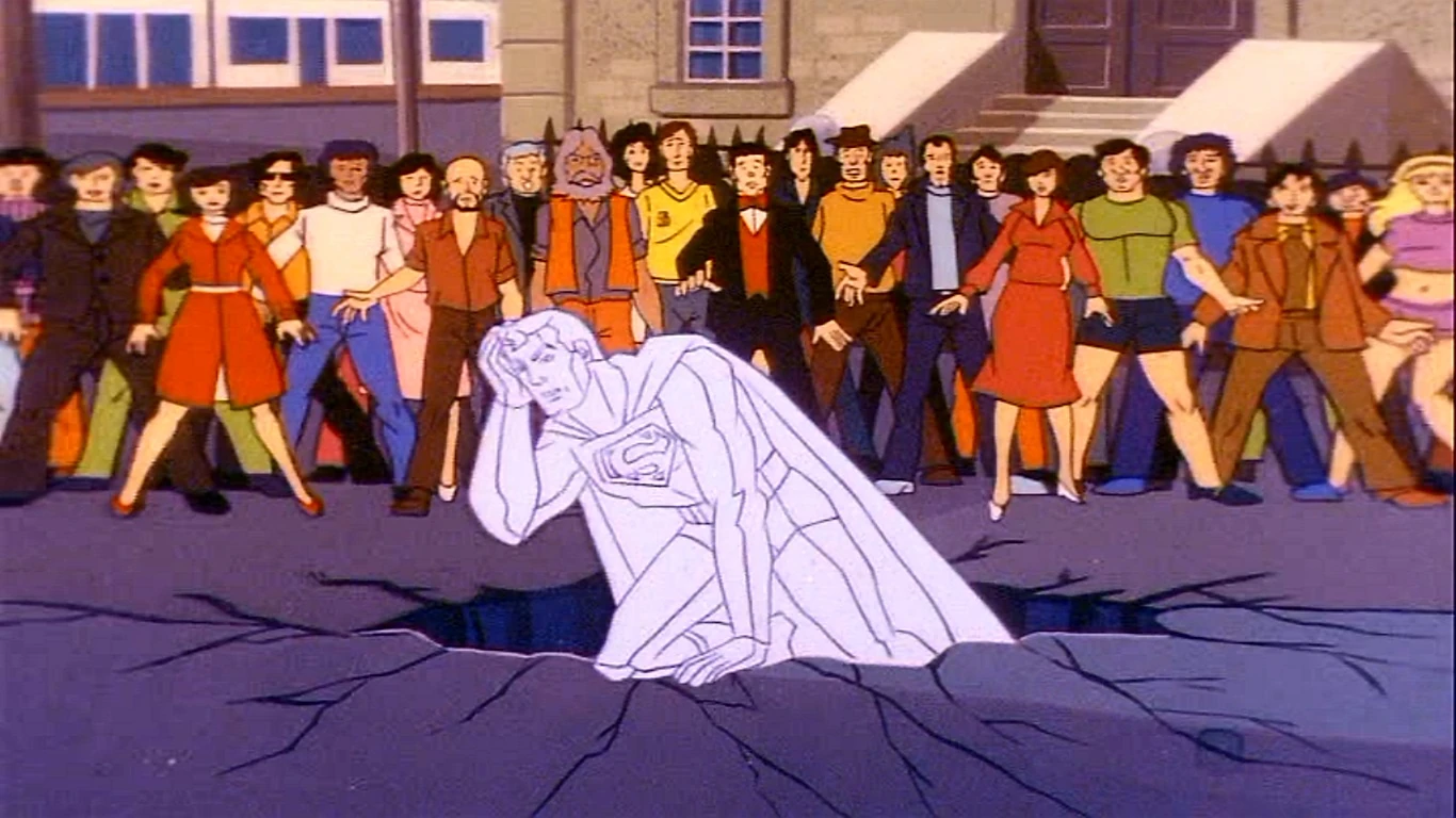 Metropolitans observe the shocking scene in which Superman is transformed into crystal.[2]