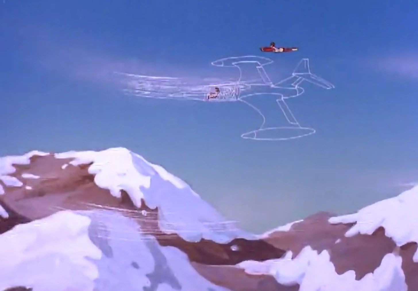 Wonder Woman flying in her Invisible Jet with Firestorm also in flight over some mountains.[1]