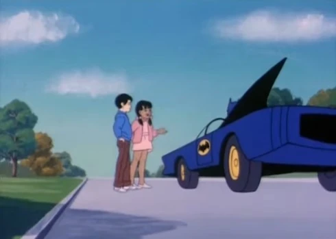 A girl and a boy were bike riding in a park with the intention of racing their bikes without using their hands. The Dynamic Duo arrived on the scene in their Batmobile and tell them that's not very safe while stopping in a parkway.[2]