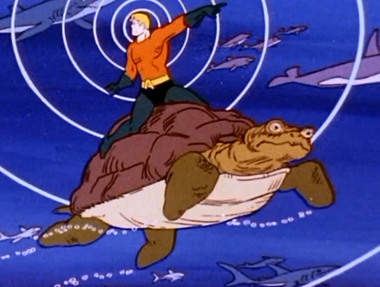 Aquaman riding a Sea turtle.[1]
