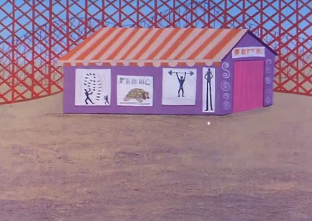 The County Museum of Art's Star of Persia exhibition is shined on by what appeared to be a laser, but the security (Security Guard 1, Security Guard 2, Security Guard 3 and Security Guard 4) takes little note of this, because the diamond is seemingly still there. However it is later revealed in the Hall of Justice by the TroubAlert that the diamond was indeed stolen. Superman, Batman and Robin go to investigate, and one of the security guards, reassures the Super Friends there must have been some sort of mistake, but Batman tells him that the TroubAlert makes no mistakes. They asked if anything suspicious had happened, and he admitted that there was some sort of unexplained light shining on the diamond, and at first they thought it disappeared, but it wasn't gone. But immediately Superman is able to tell that the diamond now in the case was a fake. Back at the Hall of Justice, Colonel Wilcox is talking to the Super Friends over the Justice League Monitor. He tells them basically what they already know, that the real Star of Persia was stolen, and replaced by a relatively worthless zircon. He asks if they have any clues to its' disappearance. Batman tells him the only thing they know, is that a red light was shining on the diamond when it was replaced by the zircon. Wilcox realizes that he sees a pattern, indicating he had seen something like that before, and Aquaman even admits that he recalls that the previous week on the cruise ship Lorelei the hundred and ten karat Mandalay diamond was stolen from the captain's safe. Wilcox then says that all occurred after the appearance of a mysterious red light. Wonder Woman then tells them that in Amsterdam the Holland Jewelry Company reported the theft of its' one hundred and twenty karat Pride of the Zuiderzee. Marvin White tells everyone that if they find the red light they'll find the precious stones that were stolen. Wilcox tells them they must be found; and Superman says he takes it that the government doesn't believe that these were simple robberies and that they were in fact part of a larger plan. Wilcox confirms this, telling him that other governments in the world believe that as well. Elsewhere, in a strange laboratory, two men are excited about the diamonds they had stolen, they look at a photograph of outer space that shows the star system of Cygnus Magnum; focusing their attention at the planet known as Cygnus-Uno, which is located in that system. They know their mission, and will do what must be done, and then they shall see who has the last laugh. Back at the Hall, the TroubAlert sounds again, this time looking for background information about other diamonds that are more than 100 karats. Wendy Harris reads the printout, stating there are only four other diamonds in the world that are more than 100 karats. One which is in the vault of the Bank of London, which Wonder Woman checks out; another is in the tomb of the pharaoh Tutankhset in Cairo, Egypt, which the Dynamic Duo check out; the third is on the yacht of multimillionaire Howard Small, in the Mid-Atlantic, which Aquaman goes to check out. The final diamond was located in a pendant worn around the neck of the wife of Jason Cadwalader, who is conducting a Benefit Circus for Deprived Children. Marvin is excited at the prospect of going to the circus, but Superman tells him that he'll have to take that responsibility, but he tells them he might be able to use their help. Robin then tells them he would have liked to check out the circus for old time's sake, since he use to be in a circus act until his parents were killed and Batman took him in. Batman admitted that he remembered Robin teaching him a few trick on the trapeze. But he tells everyone they have their assignments and they better get to them while the diamonds are still there. While outside the Hall of Justice, at the runway and hangar, Wonder Woman takes off in her invisible jet for England and Batman and Robin take off in the Batcopter, heading for Egypt. And Aquaman swims in the Atlantic Ocean, heading toward Howard Small. While at the circus, Superman in his disguise of Clark Kent, TV commentator for Galaxy Communications, arrives at the circus grounds with the kids and Wonder Dog. Clark tells them there won't be any action under the Big Top until Mrs. Cadwalader presents the plaque to the ringmaster. He asks the kids if they would like to go on some rides first, and Wendy said the Roller coaster looks fun. Marvin then tells him that he wants to throw some baseballs and win some prizes. While Wendy enjoys her roller coaster ride, Marvin plays his carnival game by trying to throw balls at some bottles to knock them over, but he doesn't succeed, and therefore doesn't win the Kewpie Doll. The Carny invites others to step right up to give it a try, three tries for 25 cents, and Marvin decides to give it another try, pulling out another quarter. A building at the circus. Meanwhile, a circus truck driven by the two men who stole the diamonds, is driving through the circus grounds. They stop the truck, and the bald man, who was the driver, hands balloons to the other guy and tells him that the red balloon must be focused on the Big Top. He walks to the back of the vehicle and sits in a chair with a hydraulic lift. Back at the carnival game, The carny assumes that Marvin is out of quarters, but Marvin tells him he's going to try one more time. While inside the Big Top, Clark Kent asks Mrs. Cadawalder if she's worried about what might happen to her diamond, but she tells him she is not, since she has with her three of the greatest detectives in the world. Outside the Big Top, the two proclaim that the balloons are in place, and that they are ready for the theft. Back inside, the diamond-jewelry wearing woman gives a plaque to the ringmaster on behalf of the board of directors from her organization. Outside, the balloons are activated, and a series of rays similar in look to lasers shine down on the Big Top, the doctor tells Wi